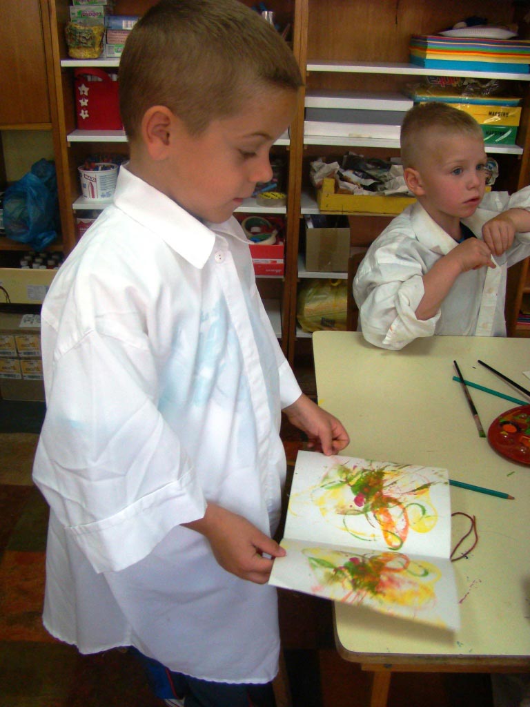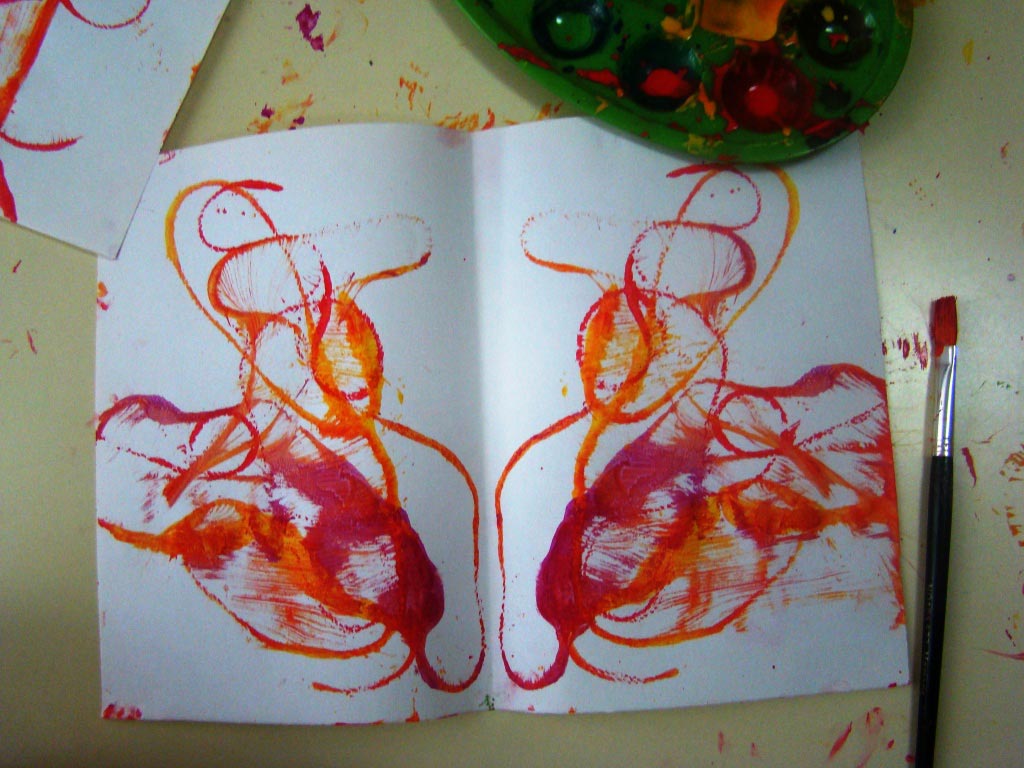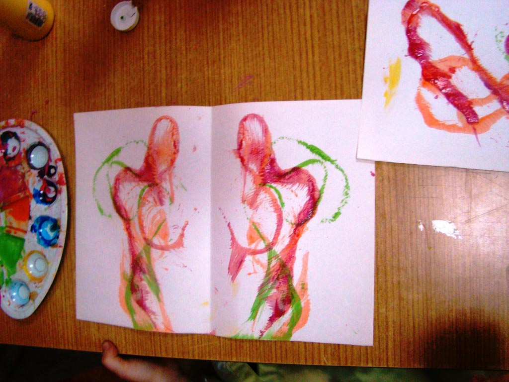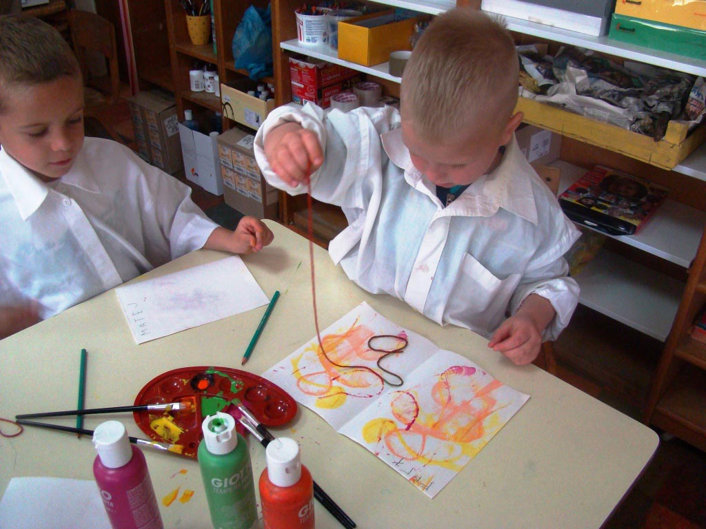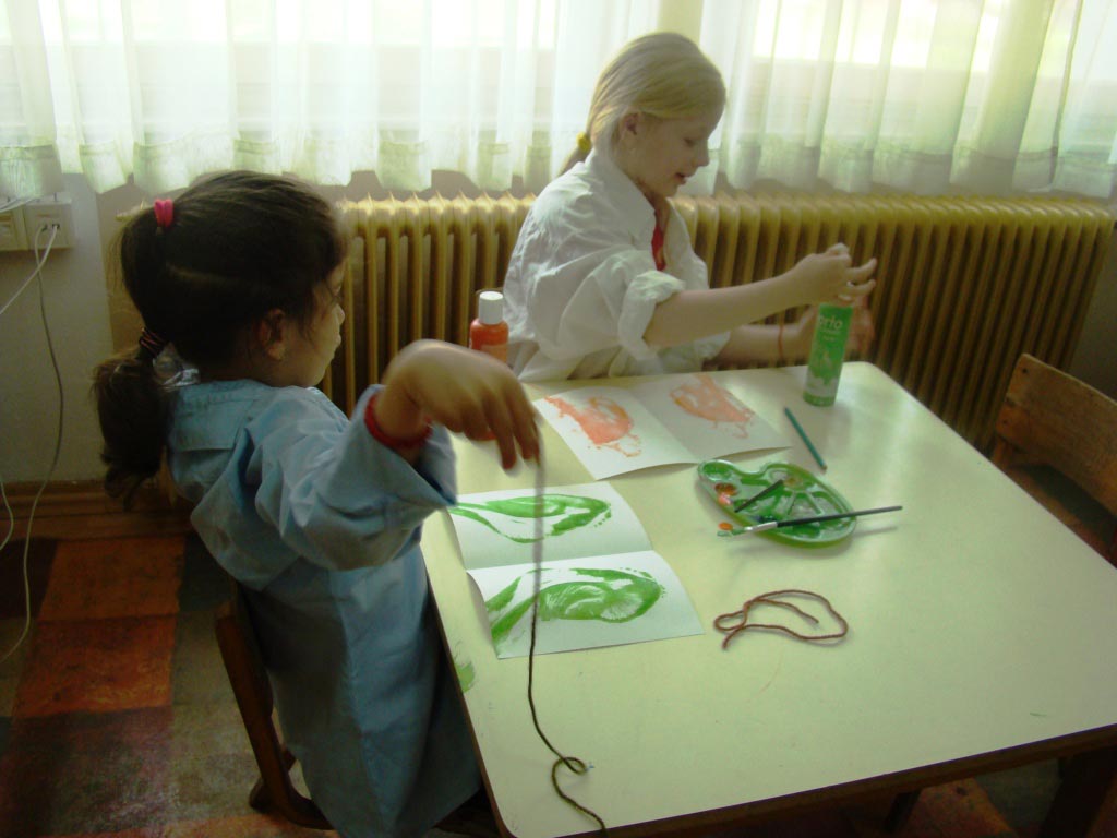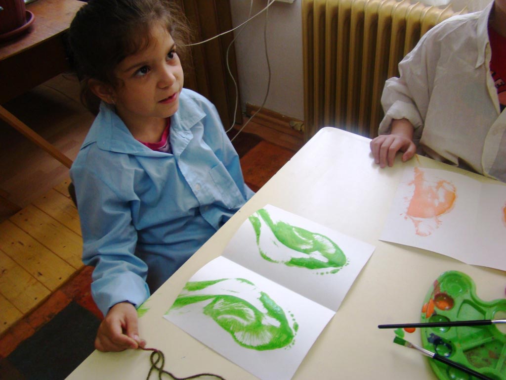 U kreativnoj atmosferi deca su imala priliku u razređenu temperu umakati parčad vunice. Vrlo spretno su provlačili vunicu ispod četke za tempere kako bi na vunici ostalo taman toliko boje da ostane dobar otisak na papiru. Potom su na listu papira kreirali oblik po želji, preklopili papir, rukicom pritisnuli složenu vunicu i izvukli je ispod papira. Na taj način su nastjale monotipije. Deca su po želji kombinovala oblike i boje, na najrazlićitije i najmaštovitije načine. Beskrajno su se zabavljali, pomagali i predlagali jedno drugom koje boje da kombinuju.