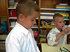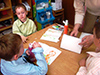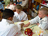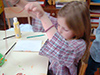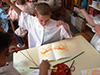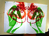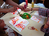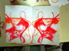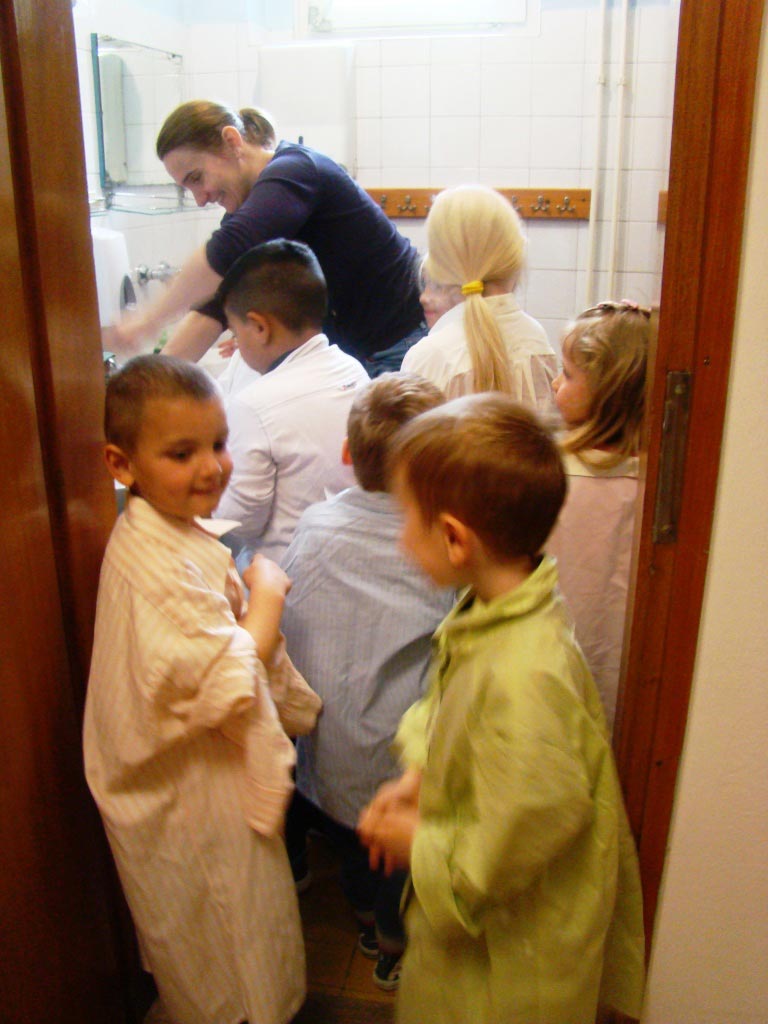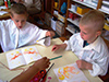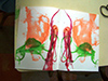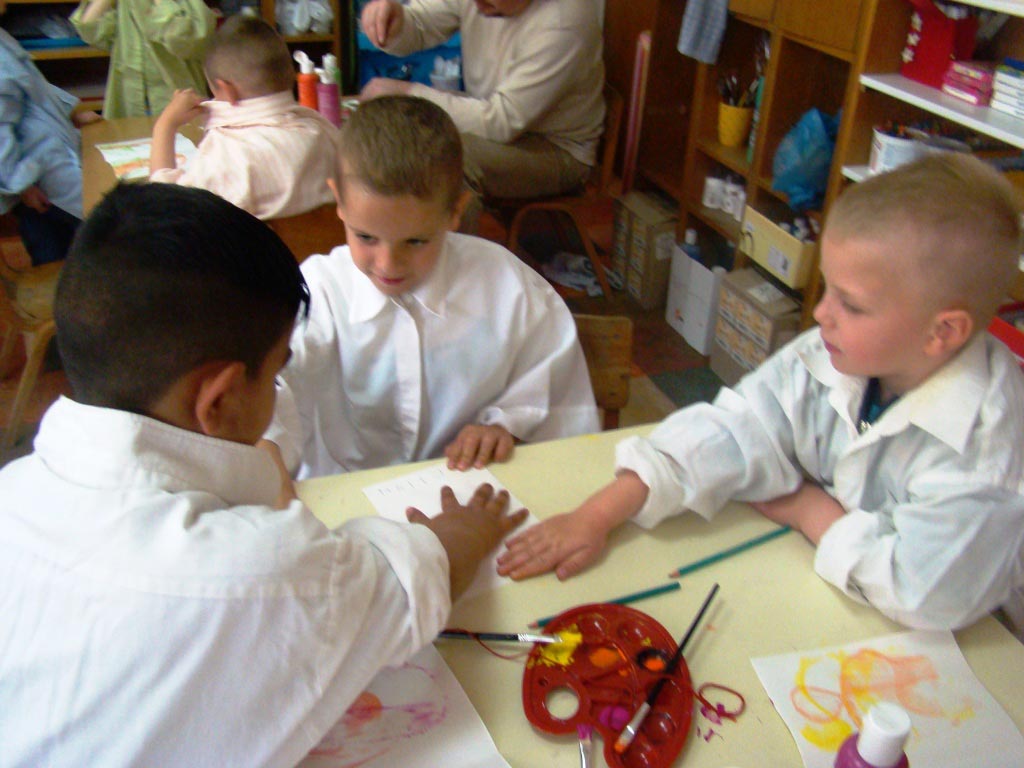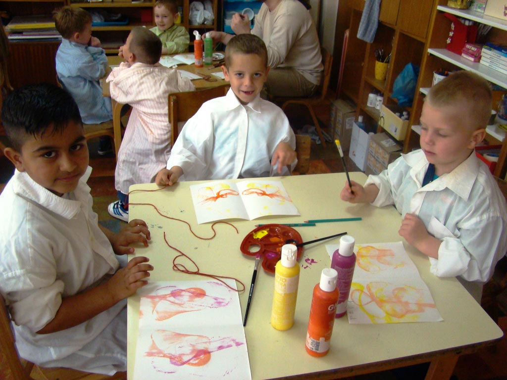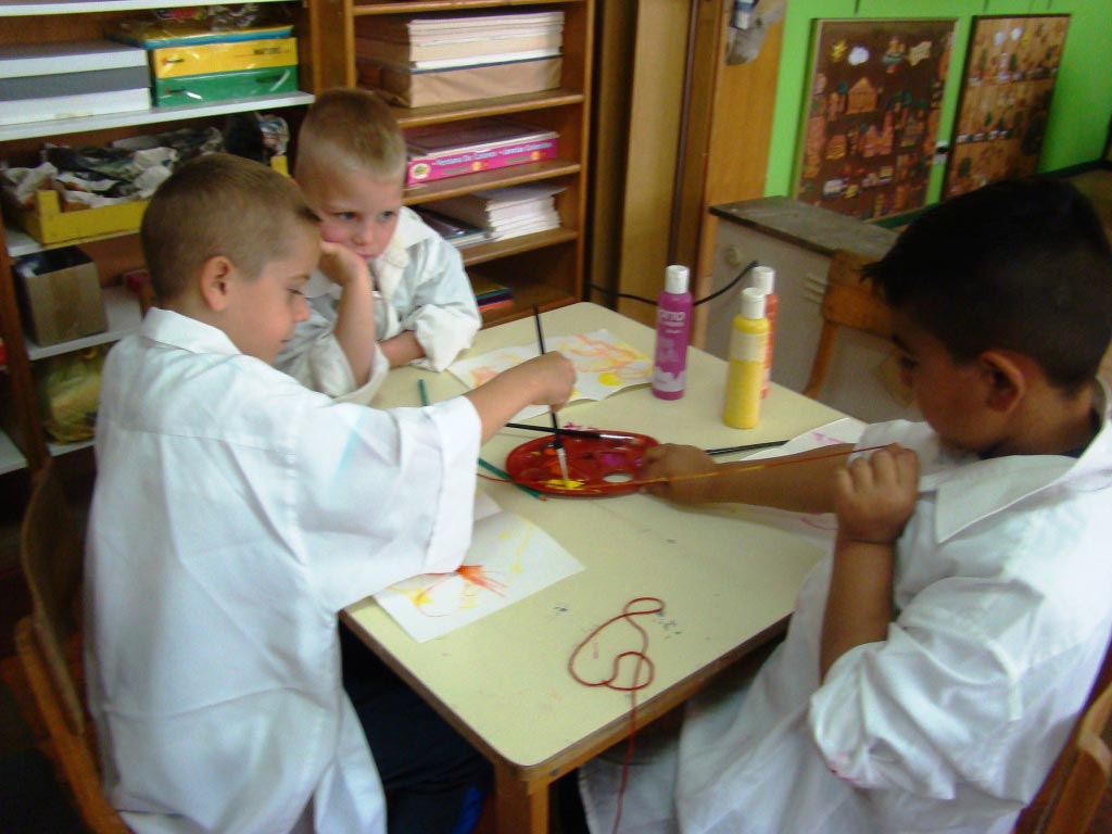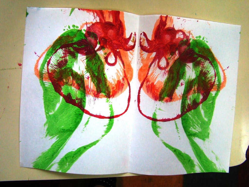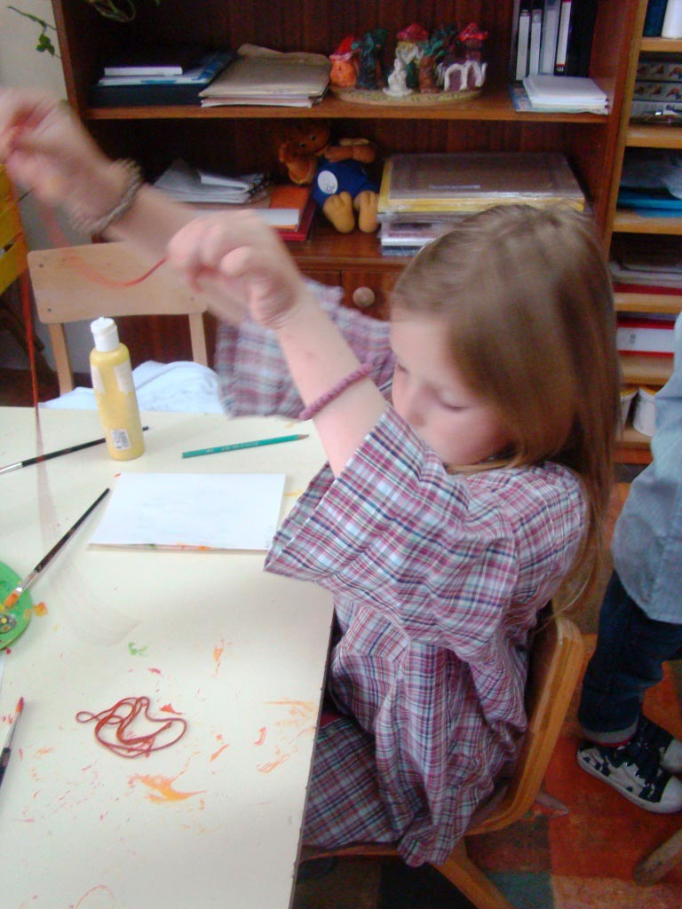 U kreativnoj atmosferi deca su imala priliku u razređenu temperu umakati parčad vunice. Vrlo spretno su provlačili vunicu ispod četke za tempere kako bi na vunici ostalo taman toliko boje da ostane dobar otisak na papiru. Potom su na listu papira kreirali oblik po želji, preklopili papir, rukicom pritisnuli složenu vunicu i izvukli je ispod papira. Na taj način su nastjale monotipije. Deca su po želji kombinovala oblike i boje, na najrazlićitije i najmaštovitije načine. Beskrajno su se zabavljali, pomagali i predlagali jedno drugom koje boje da kombinuju.