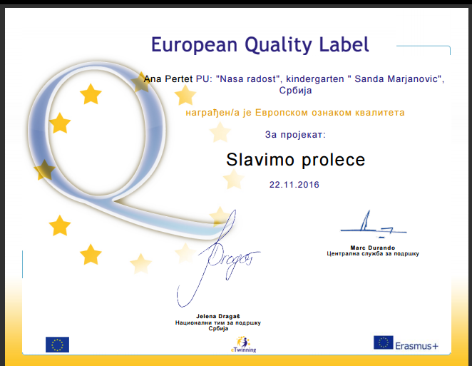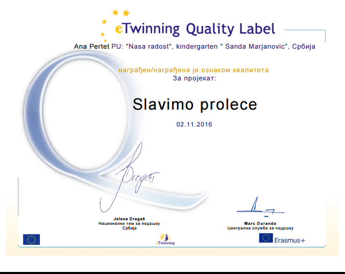 PU “Naša radost” je ukupno dobila 10 Nacionalnih i 7 Evropskih oznaka kvaliteta za eTwinning projekte.