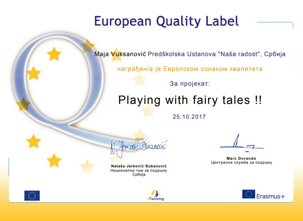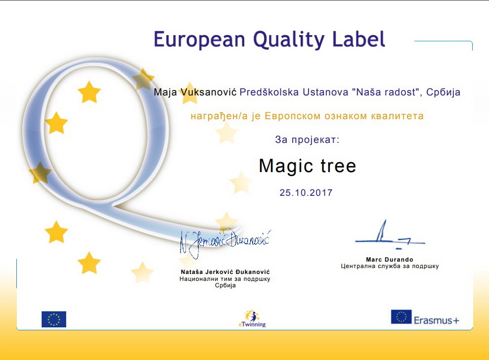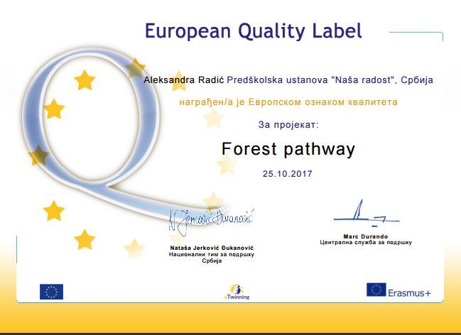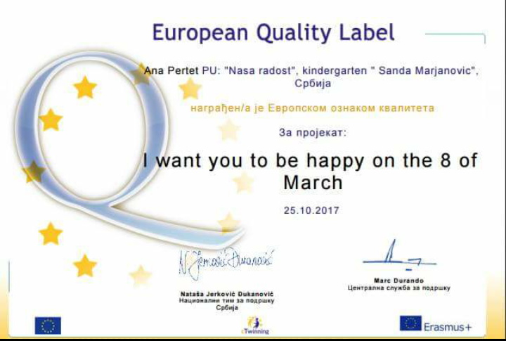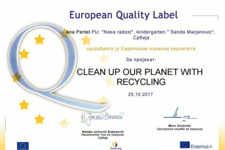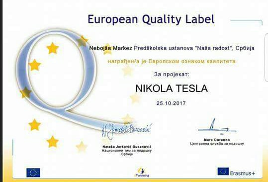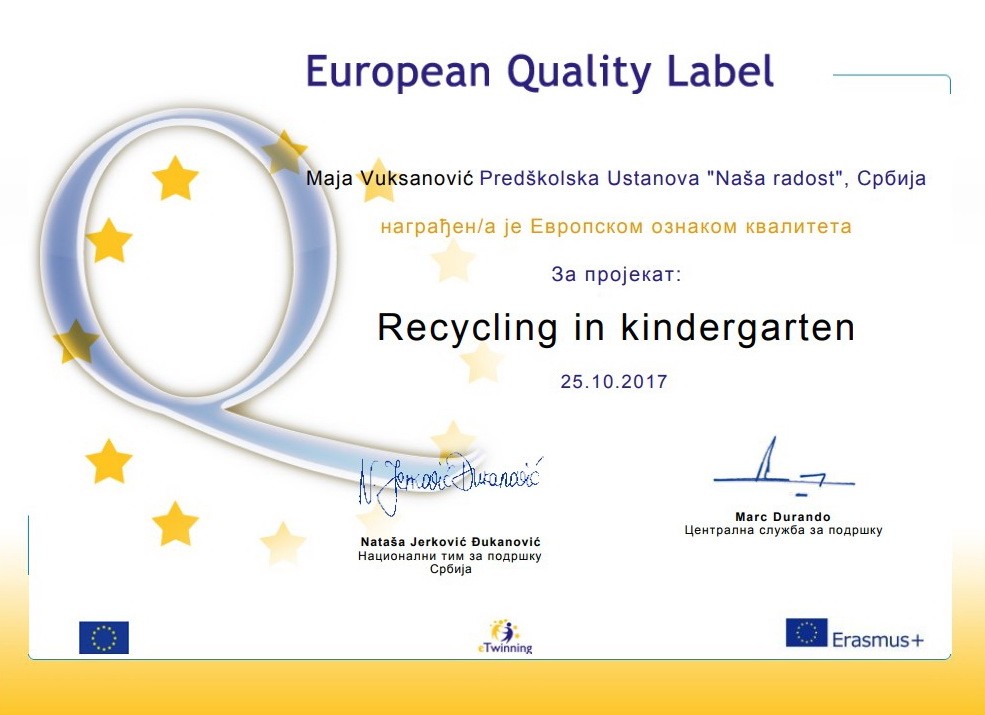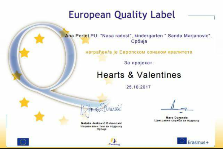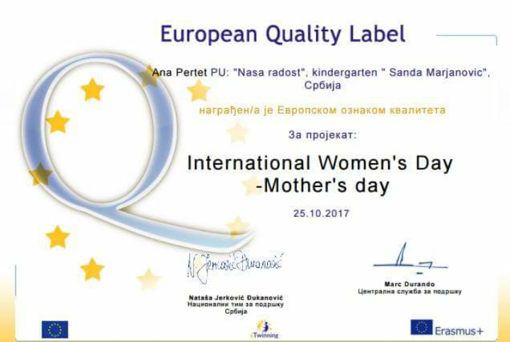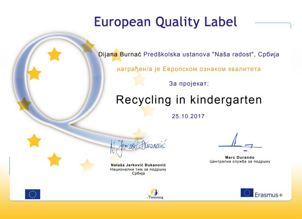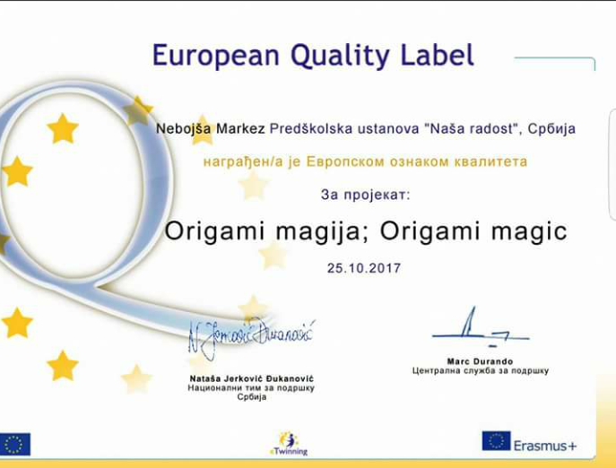 U oktobru 2016. godine Nataša Vrapčević je prisustvovala ambasadorskoj konferenciji PDW na Rodosu. U 2017. godini vaspitači : Sandra Radić, Nebojša Markez, Maja Vuksanović, Dijana Burnać , Ana Pertet i Nataša Vrapčević su dobili 21 EQL za projekte u kojima su osnivači ili učesnici. Sertifikati su im uručeni na godišnjoj eTwinning konferenciji u Beogradu , u septembru 2017.