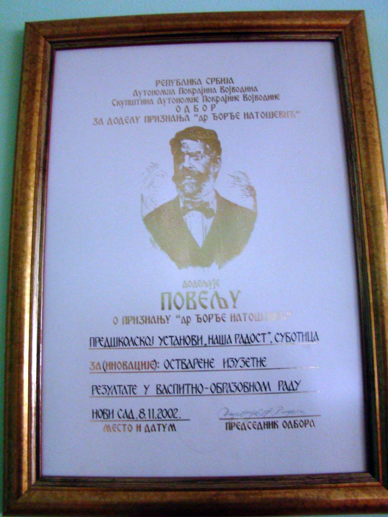 Predškolska ustanova "Naša Radost " ocenjena je za svoj rad sa visokom ocenom: 4.