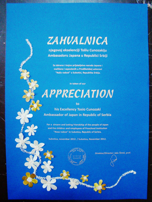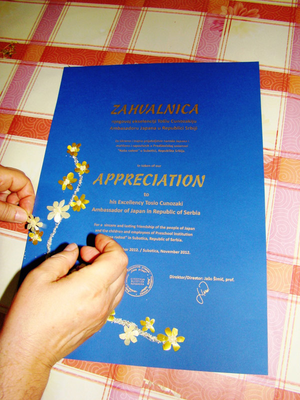 Povod je bila želja da se abasadoru Japana, g. Tošiu Cunozakiju tokom njegovog boravka u Subotici pokloni zahvalnica za dugogodišnje prijateljstvo. Realizacijia ideje saradnika za likovno Ljubice Suturović i animatora kulturnih aktivnosti Arsena Ćosića da zahvalnica bude ukrašena motivima izrađenim od slame ogledala se u održavanju prve slamarske radionica za mališane, vaspitača i zainteresovane roditelje vrtića MARIJA PETKOVIĆ. Poziv je upućen gospođi Jozefini Skenderović, koja se slamarskom umetnošću bavi tridesetak godina.