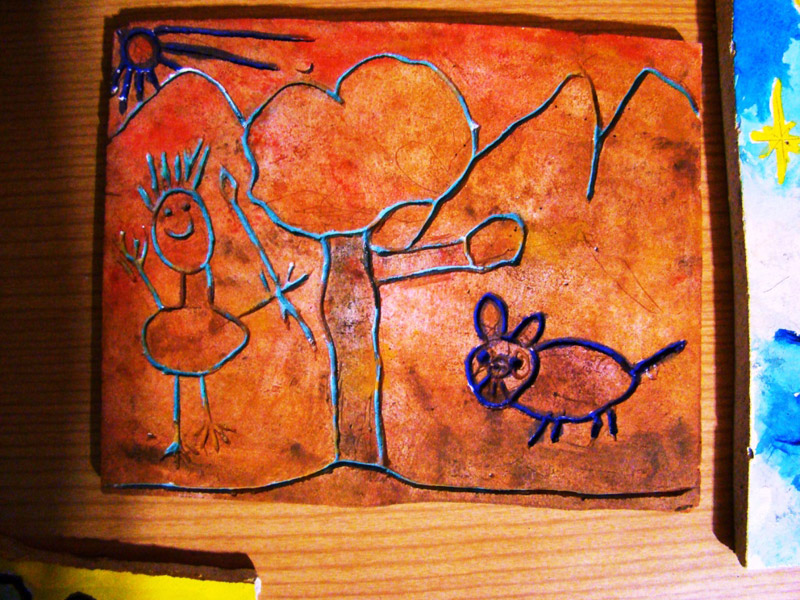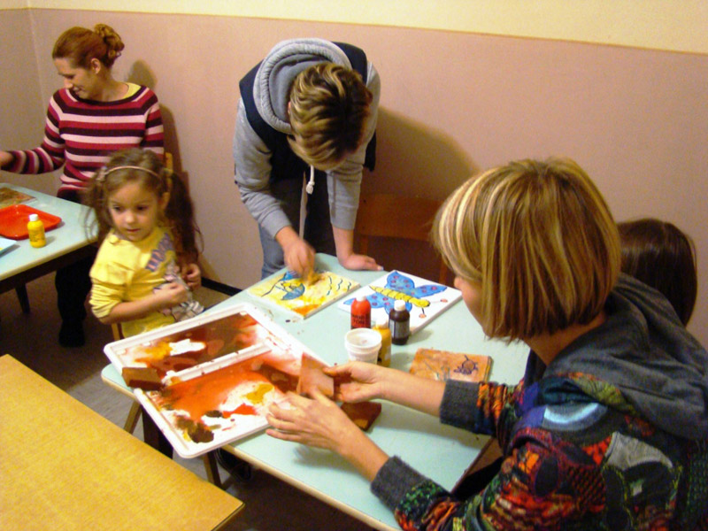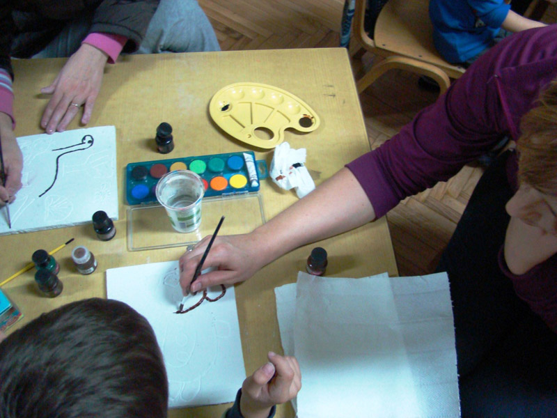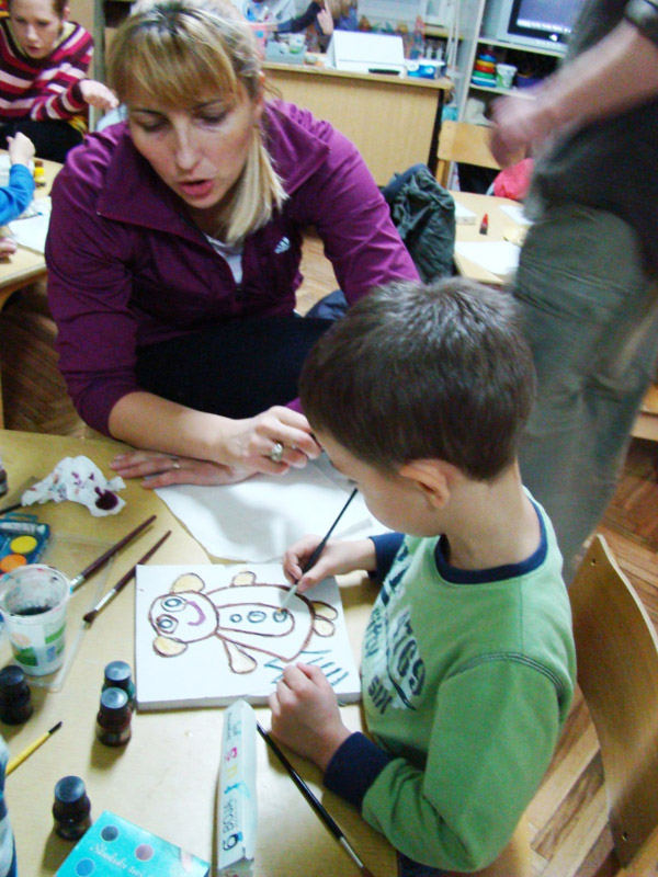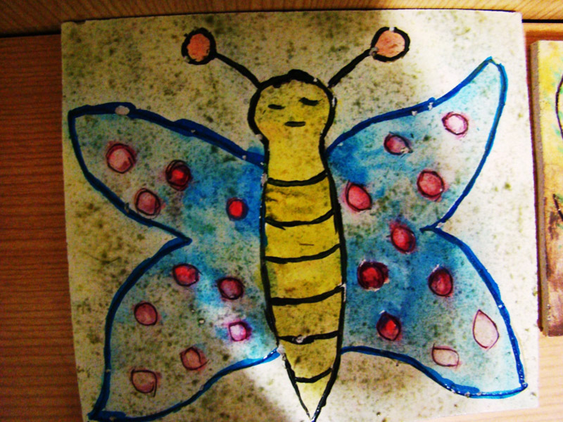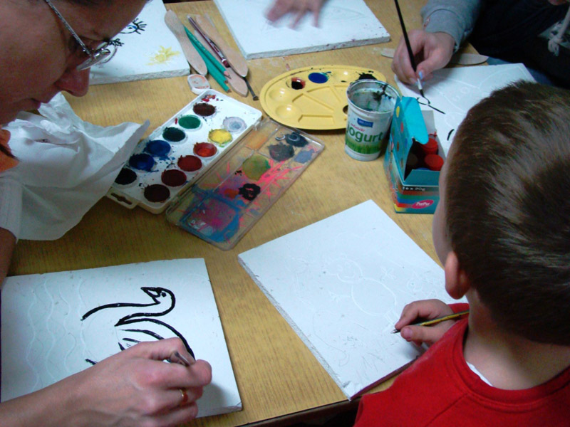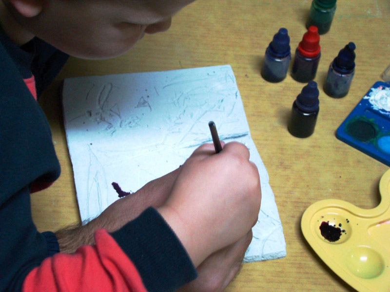 Radionicu gipsoreza na gips pločama vodili su Ljubica i Arsen, saradnici za likovne i kulturne aktivnosti Ustanove. Kameni crtež nastaje tako što se ba gips ploči olovkom nacrta crtež čije se linije pose izdubljuju u gips ploči. zatim se četkicom i tušem uz pomoć puno vode sve to oslikava. Završni izgled tj. simulacija kamena dobija se tako što se sunđerom tonira ceo crtež.