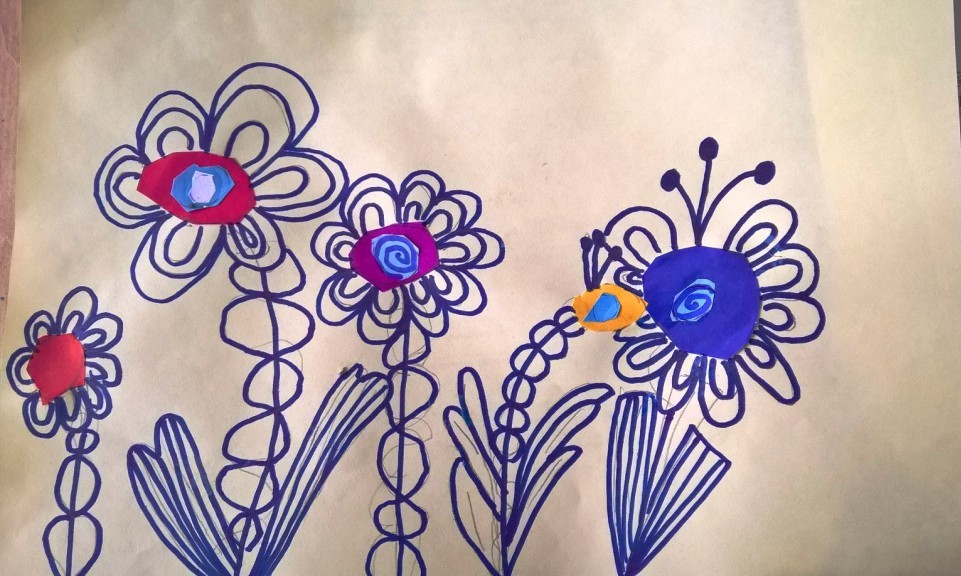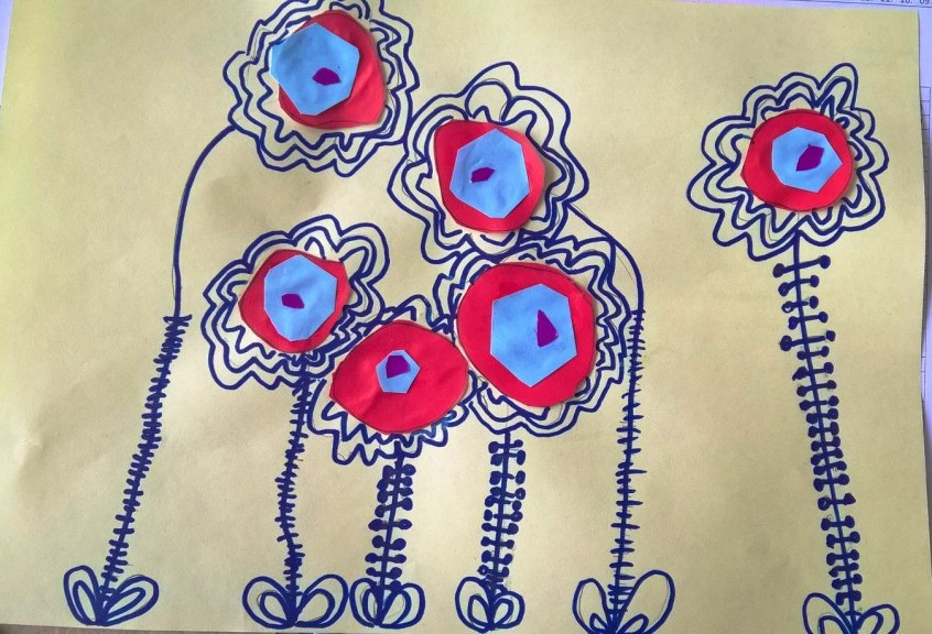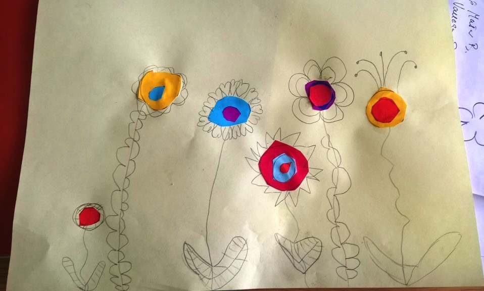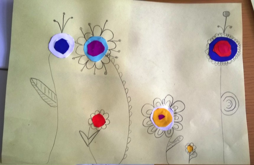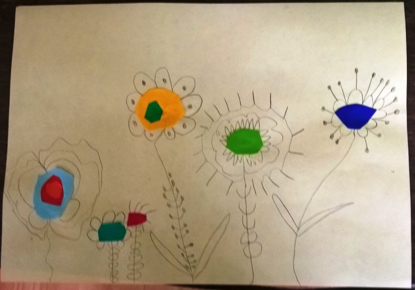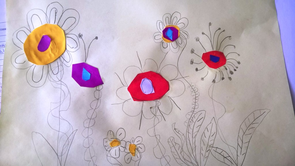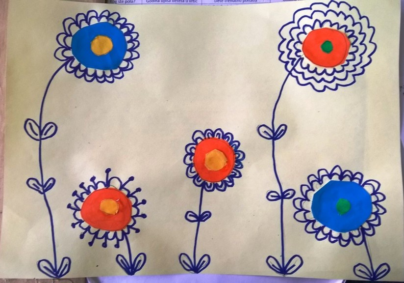 Nakon što je sredina zalepljena, latice, prašnici i listovi docrtani su grafitnom olovkom. Da bi cvetovi bili vidljiviji, sve što je nacrtano olovkom pojačano je flomasterom. Spretno baratajući makazicama, vešti šestogodišnjaci izmaštali su najčudnije cvetove.