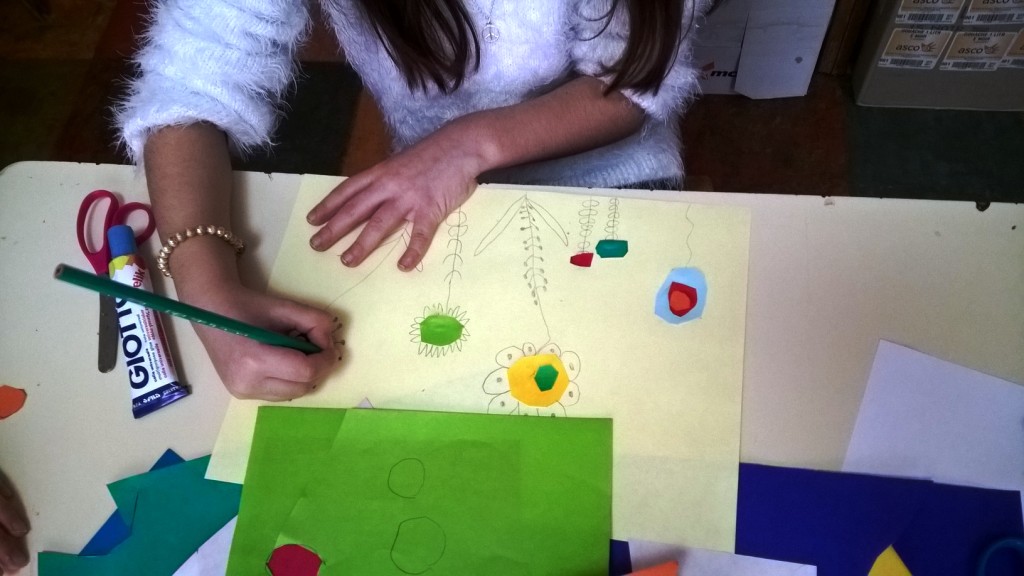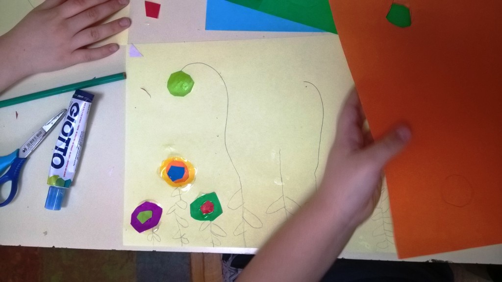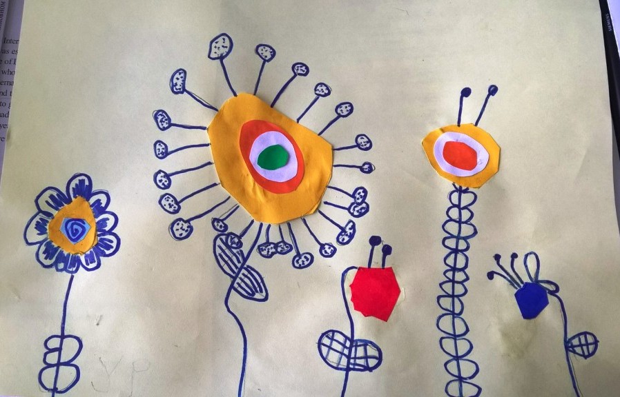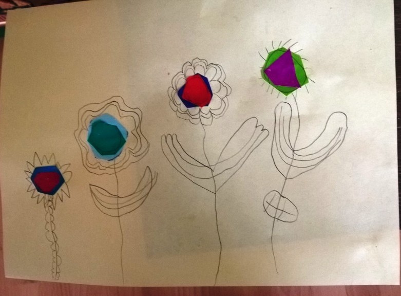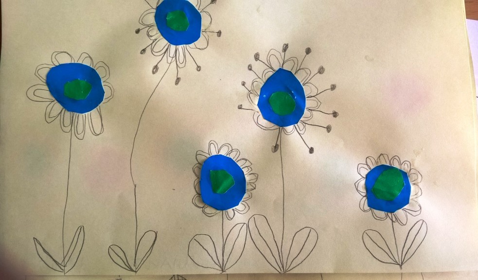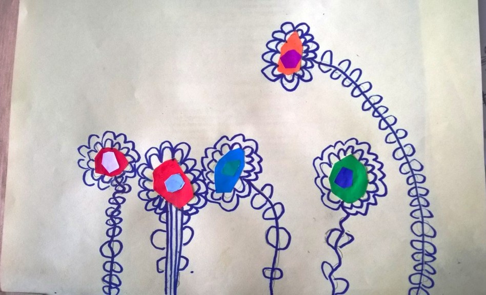 Nakon što je sredina zalepljena, latice, prašnici i listovi docrtani su grafitnom olovkom. Da bi cvetovi bili vidljiviji, sve što je nacrtano olovkom pojačano je flomasterom. Spretno baratajući makazicama, vešti šestogodišnjaci izmaštali su najčudnije cvetove.