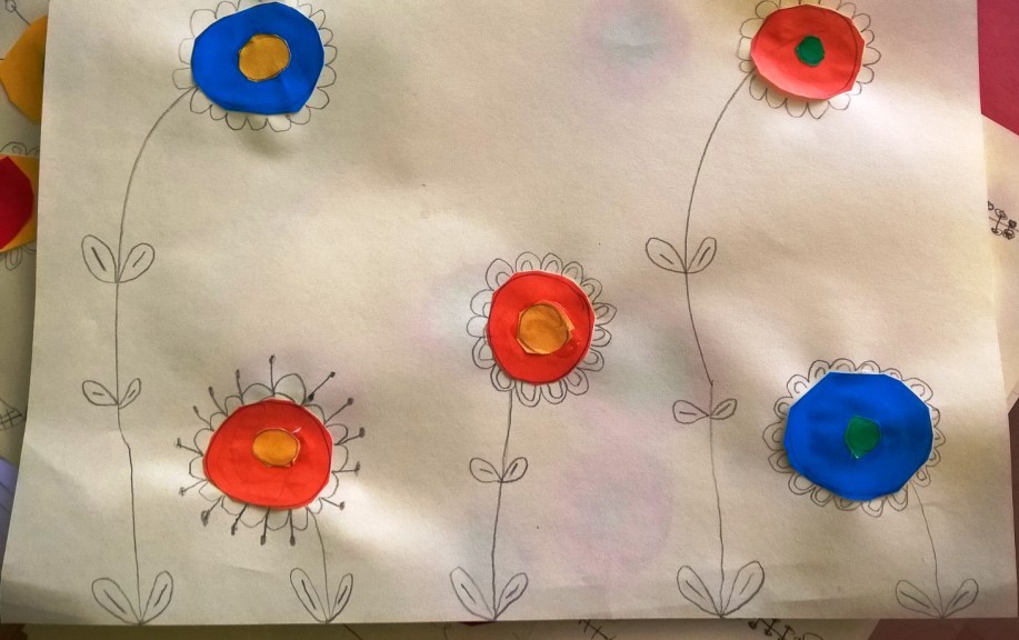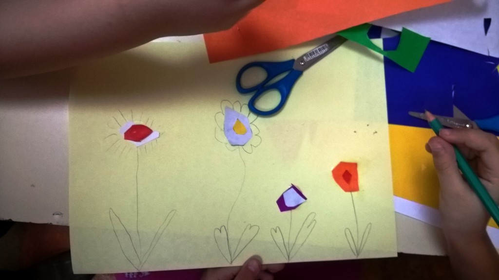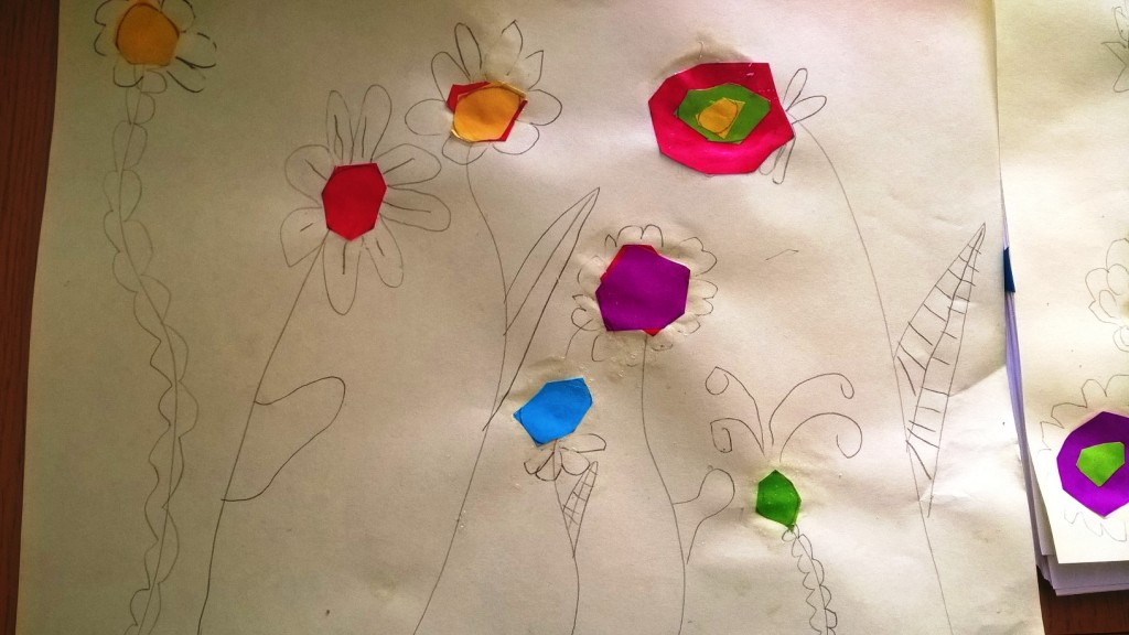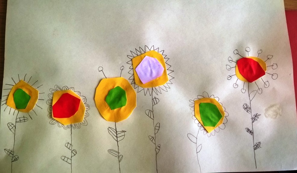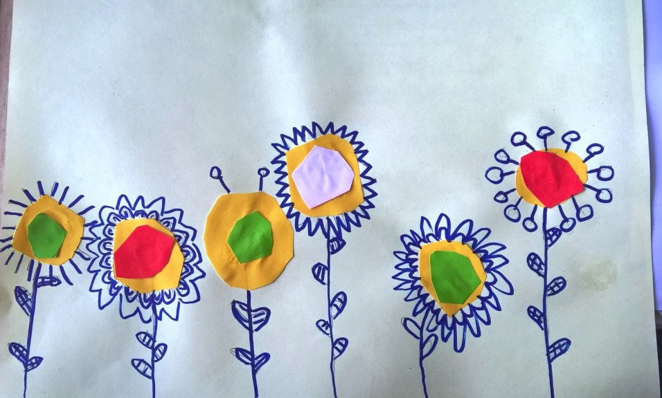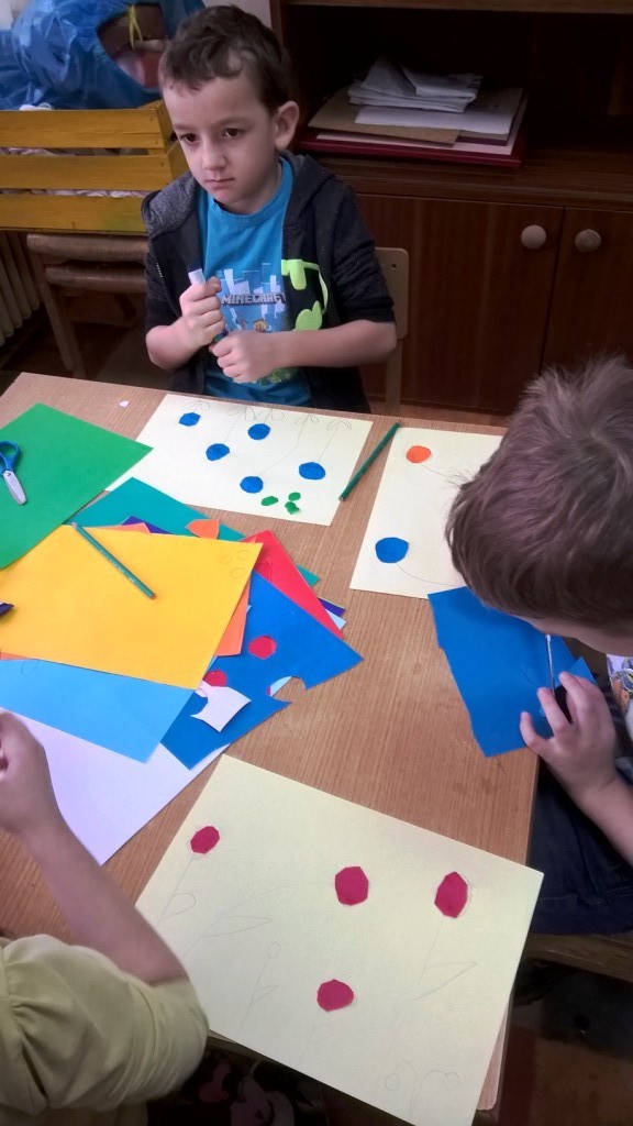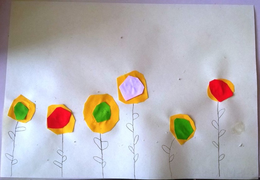 Sredina cvetova je pravljena seckanjem i lepljenjem kolaž papira, u dve ili tri boje.