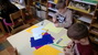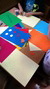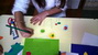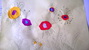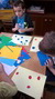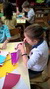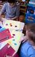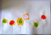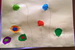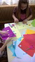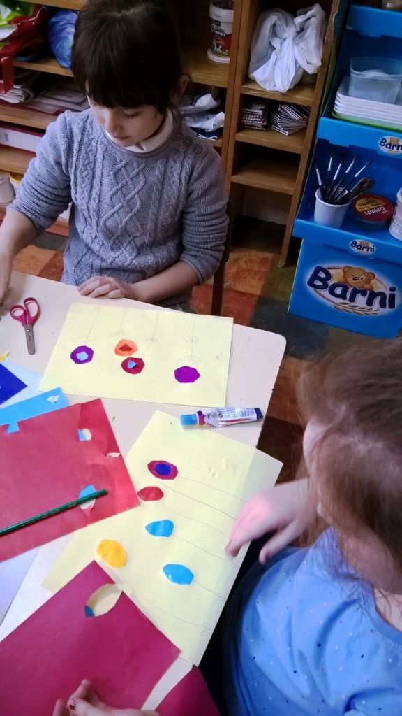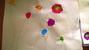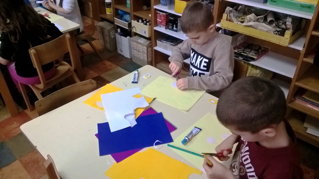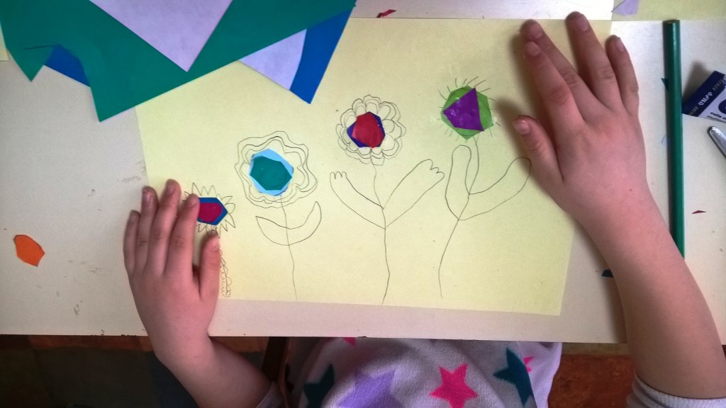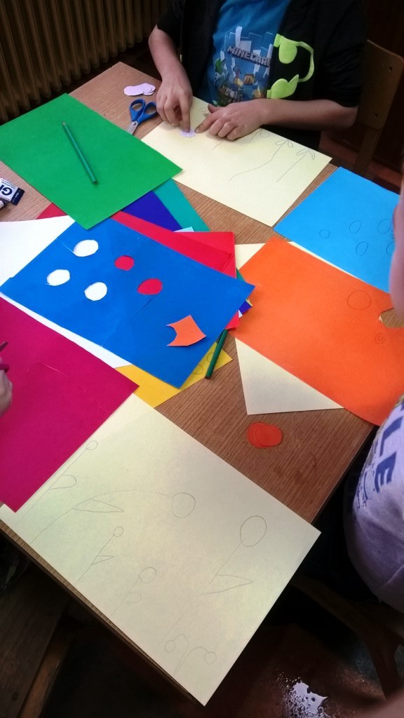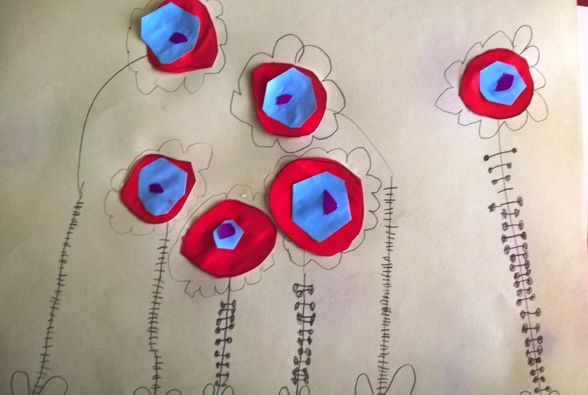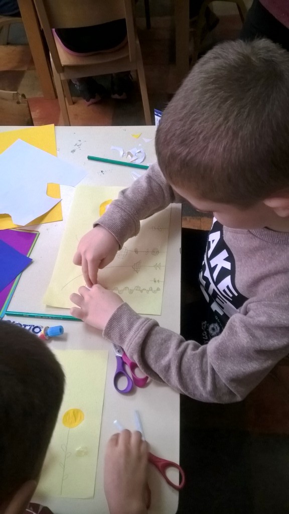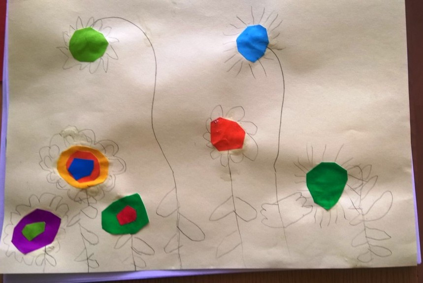 Sredina cvetova je pravljena seckanjem i lepljenjem kolaž papira, u dve ili tri boje.