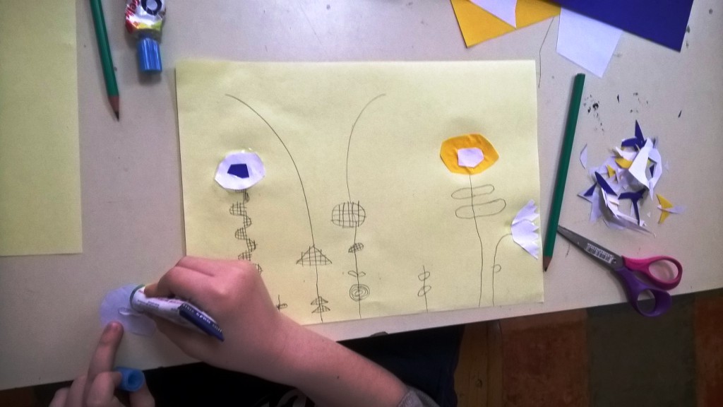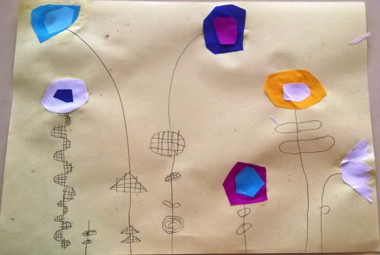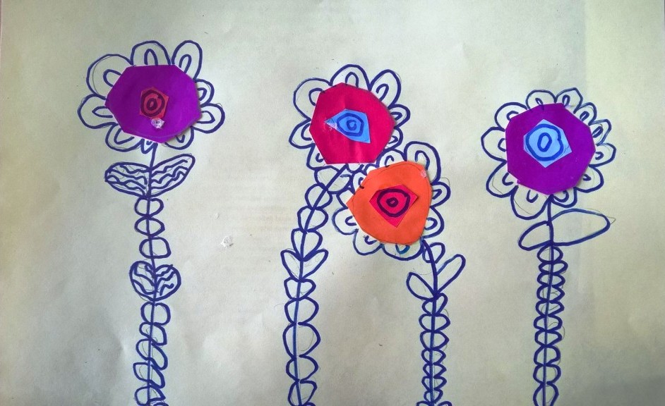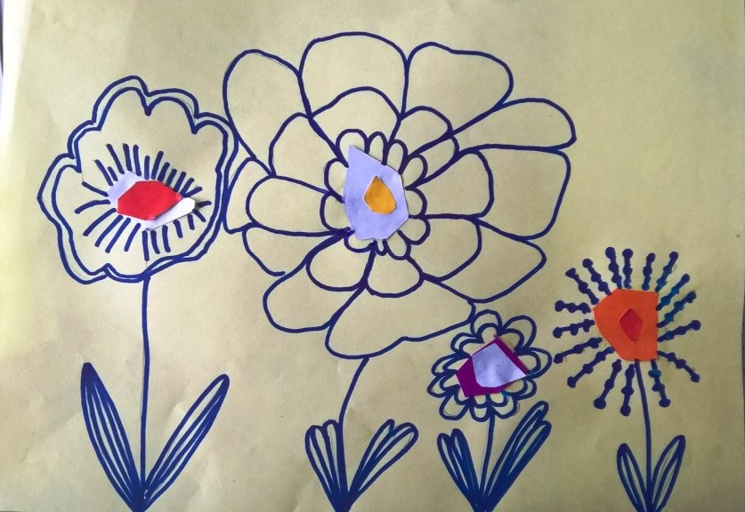 Cvetne slike rađene su kombinovanom tehnikom kolaža i crtanja grafitnom olovkom i flomasterom. Prvi korak je bio rasporediti cvetove na papiru. Deca su vodila računa da stvore kompoziciju koja će popuniti celu površinu papira.
